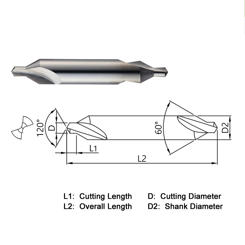 • 2 FLUTE - DOUBLE END COUNTERSINK - SOLID CARBIDE - BRIGHT - METRIC • Available in 60° point angles • Available in 1mm - 5mm cutting diameters in carbon, alloy, stainless steels, and aluminum
