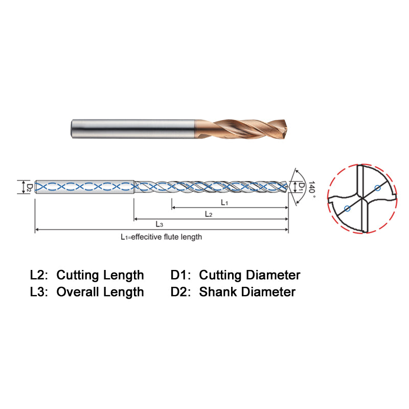 • 2 FLUTE - 3XD CUT LENGTH - SOLID CARBIDE - TiALN+HH COATING - METRIC • Double Margin • 140° point angle • Cutting diameter range = 3mm - 20mm • Good up to 50HRc • Excellent in alloy & stainless steel, cast iron and harden steels up to 50HRc