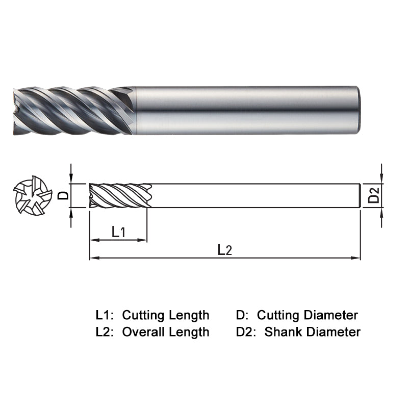 Endmill, Series XE505, Carbide, 6mm Dia, 5 FL, 13mm LOC, 57mm OAL, TiAlN Coated, 6mm Shank, 0.05 lb, Metric Sizes